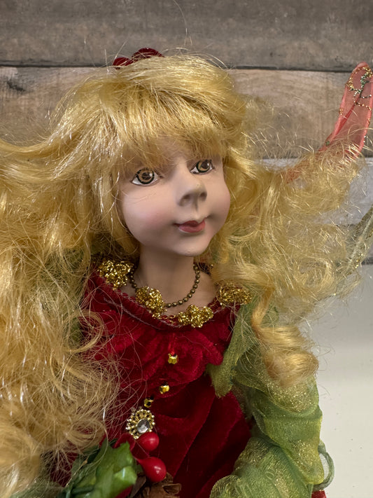 Windward Holidays Fairy – Blonde in Red Dress Holding Christmas Wreath 13"
