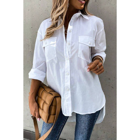 Solid Button-Up Pockets Long Sleeve Blouse – Elings