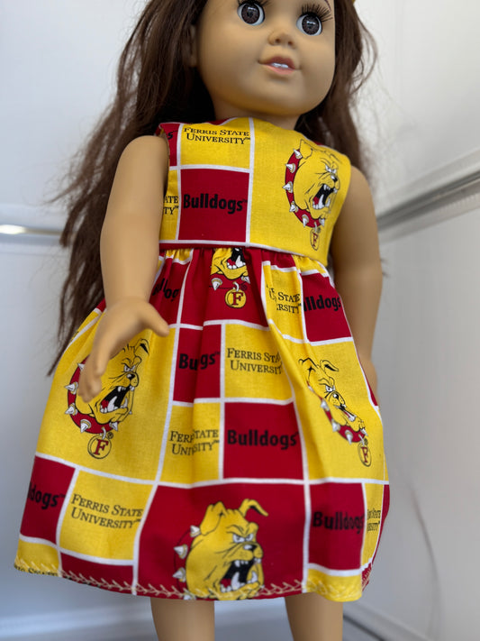 Handmade 18" Doll Clothes – Red & Gold Bulldog-Inspired Dress with Matching Bow