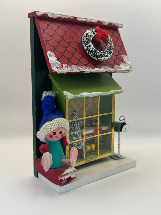 Vintage Putz House Christmas Decoration – Miniature Cardboard House with Elf & Fireplace Scene