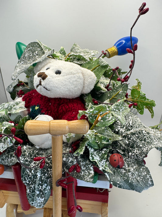 Vintage Teddy Bear Christmas Centerpiece in Wooden Wagon – Festive Holiday Décor
