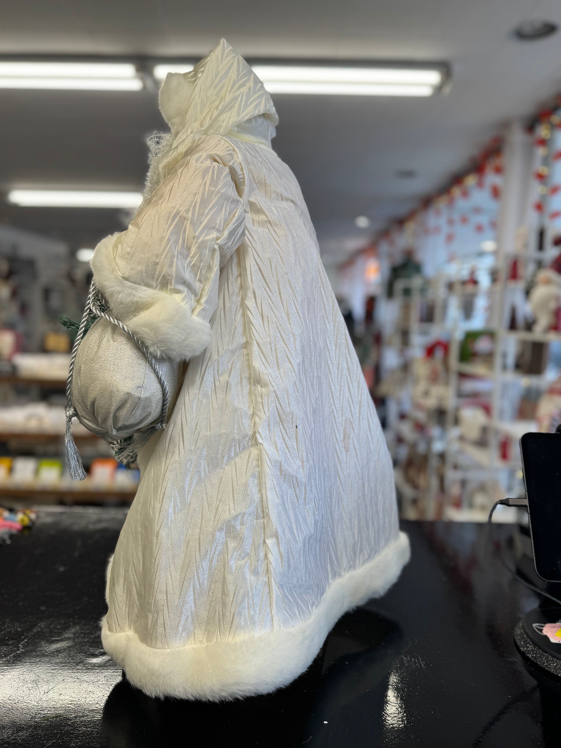 Bring elegance and sparkle to your holiday décor with this stunning 30-inch Winter Wonderland Santa. Dressed in a luxurious white faux fur coat and hat with shimmering silver accents, this Old World–style Santa holds a staff, a small white bear, and a festive sack of gifts. Designed to be used as a freestanding display or as a striking tree topper, this piece captures the magic and grace of a snowy Christmas scene.
