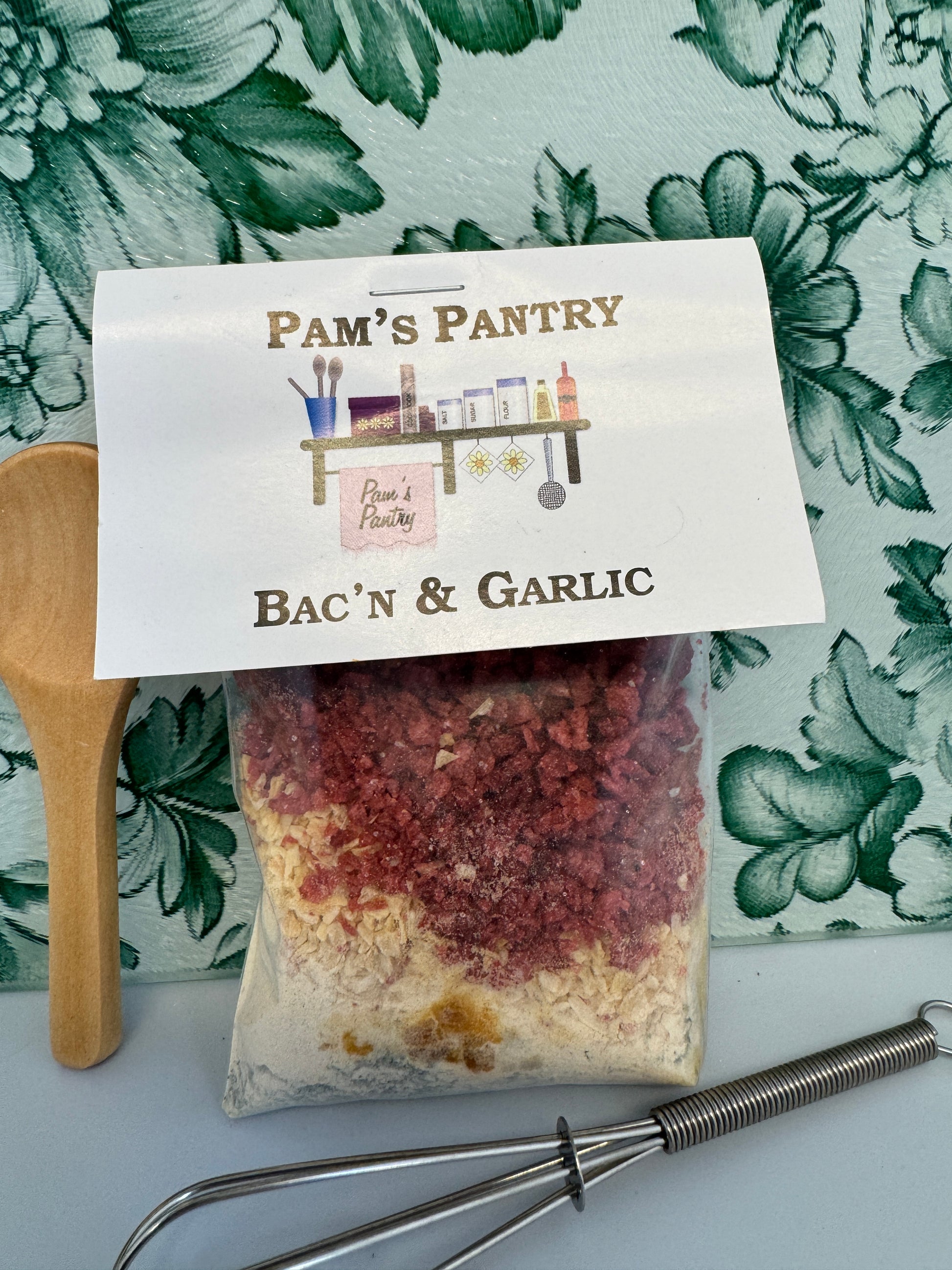 A cool, creamy blend with bits of farm fresh bacon and a hint of garlic. This great mix goes great on some crackers, chips, sandwiches, burgers and as a tater topper! Pack mixes with 8 oz sour cream and 8 oz mayo. Makes approx 2 cups.