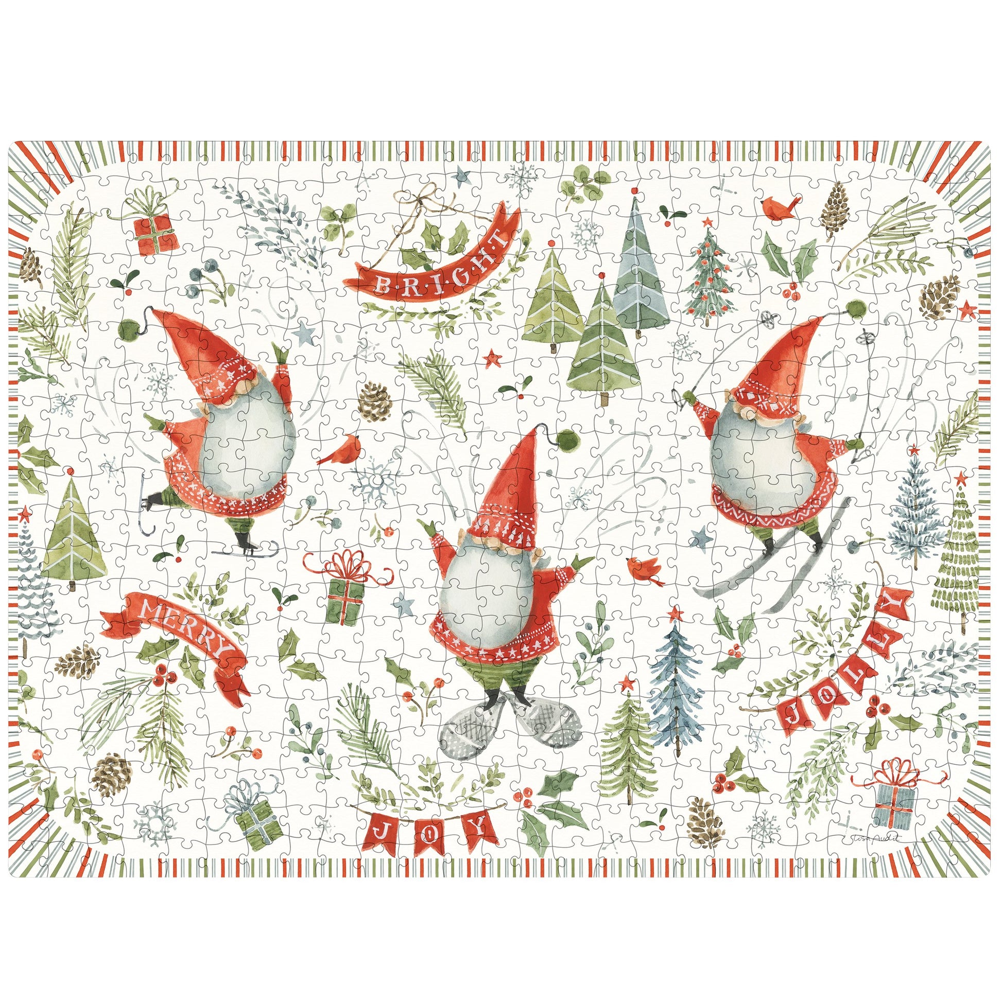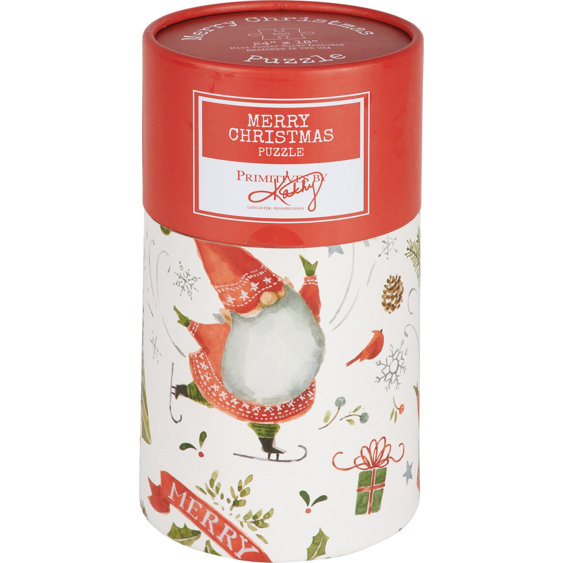 A 500 piece puzzle from our Christmas Collection displaying a hand painted scene of jolly Christmas gnomes surrounded by holiday imagery and sentiments. Puzzle pieces are packaged in a resealable plastic bag and enclosed in a cylindrical box with the design displayed around outside and a descriptive "Merry Christmas Puzzle" sentiment on lid. Our Christmas Gnomes puzzle includes an 10 inch x 8 inch printout of full puzzle image for reference. Contains small parts; this is not a toy. A charming accessory great for seasonal gifting.
