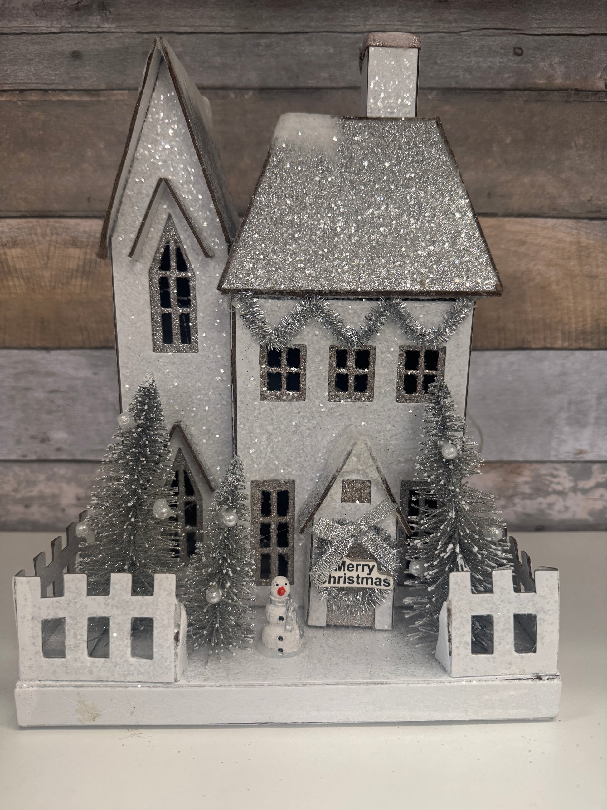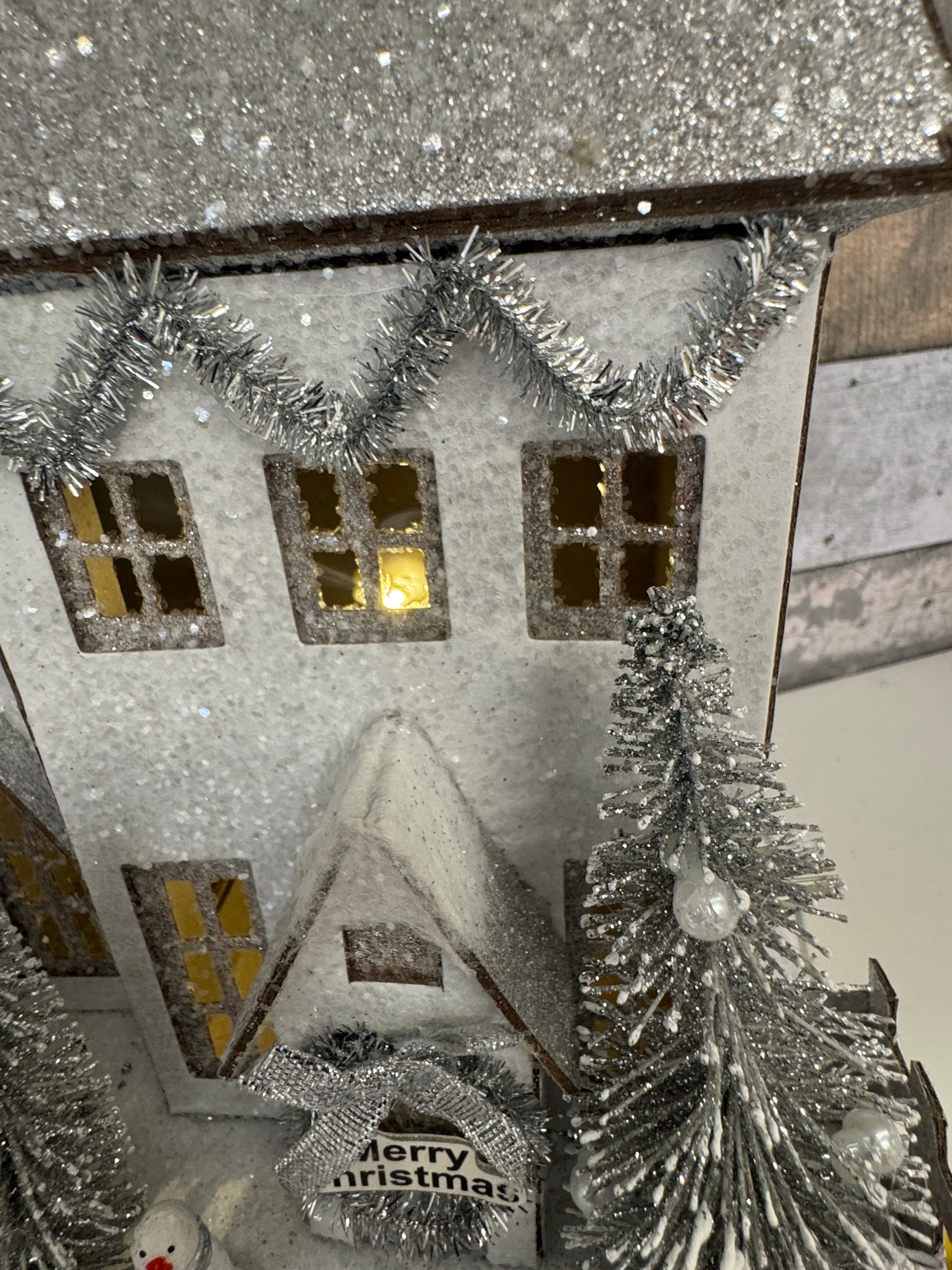 Crafted from paper pulp and accented with glitter, mica, and batting snow, this charming mill house features a snowy blue exterior, a cheerful snowman figure, and miniature bottle brush trees for a nostalgic winter scene.