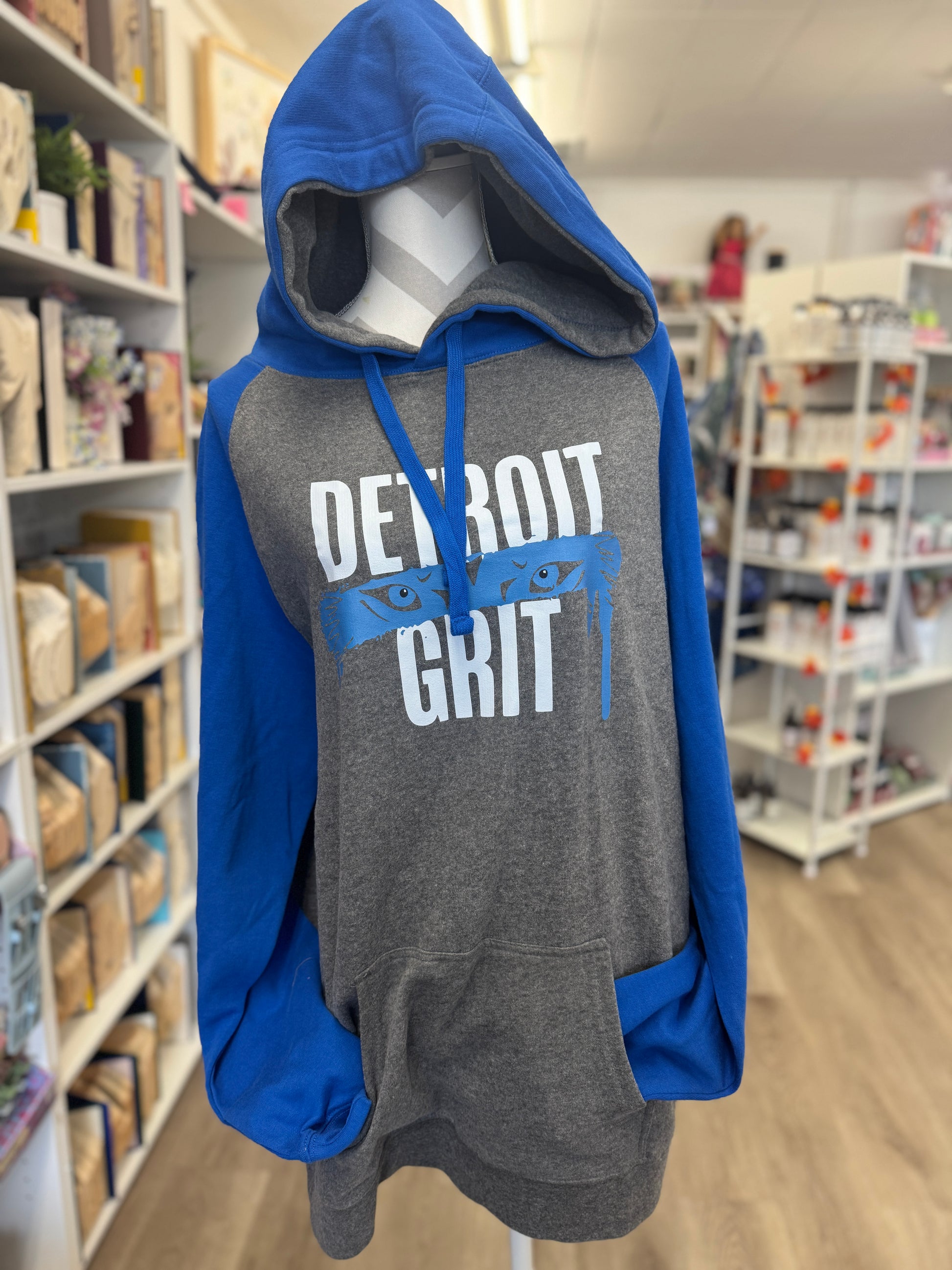 The Detroit Grit Hoodie blends bold city style with cozy everyday wear. Featuring a striking two-tone design in charcoal gray and royal blue, this hoodie makes a statement with its eye-catching “Detroit Grit” front graphic — complete with fierce detail that reflects the strength and determination of the city itself.