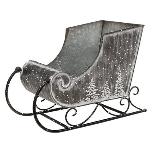 Small Embossed Snowy Pine Tree Metal Sleigh is a winter tabletop piece made of galvanized metal. Sleigh features embossed pine trees with a distressed white finish and distressed white marks for a snowy look. Sleigh adds texture and intrigue on its own, but it can be used for displaying fabric fillers, candles, and florals for a unique holiday display. Measures 9.5" high by 6" wide by 14" deep.