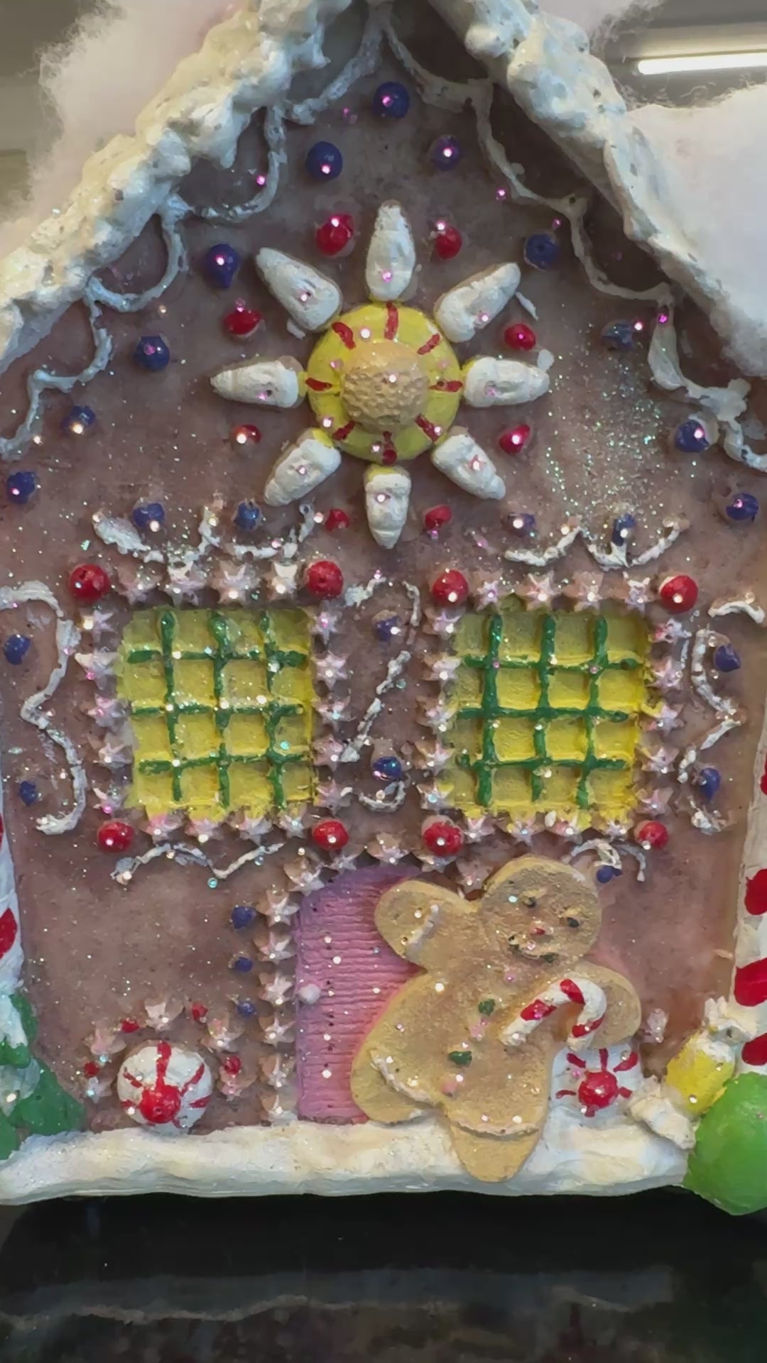 With its nostalgic gingerbread design — complete with candy canes, peppermint swirls, and snow-covered rooftops — this house captures the joy and whimsy of the season. When lit, it creates a cozy glow that feels like it came straight from a Christmas storybook!