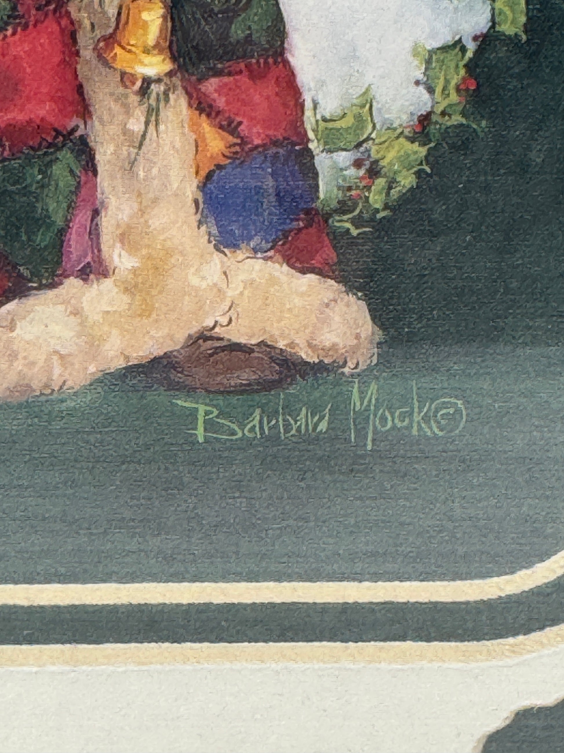 This vintage framed art print titled “Patchwork Santa” by artist Barbara Mock beautifully captures the warmth and nostalgia of Christmas. The artwork features Santa Claus dressed in a charming patchwork-style coat, holding a festive wreath and a sack filled with toys.