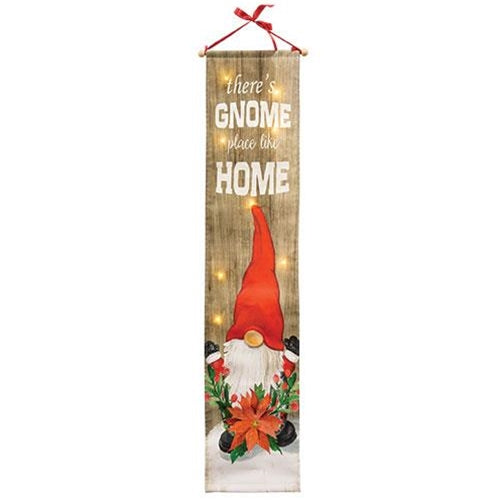 Gnome Place Like Home Banner with LED Lights is a thick fabric banner that features a festive gnome and poinsettia design with the phrase, "there's gnome place like home." The banner includes 8 built-in lights for a magic touch that looks great on a front door or in an entryway. Item hangs on a wood dowel with a red ribbon hanger, and the back of the banner has a small pouch that holds the battery pack, which requires 2 AA batteries (not included). Measures 47.5" high (51" hanging) by 12.25" wide and 1" deep.