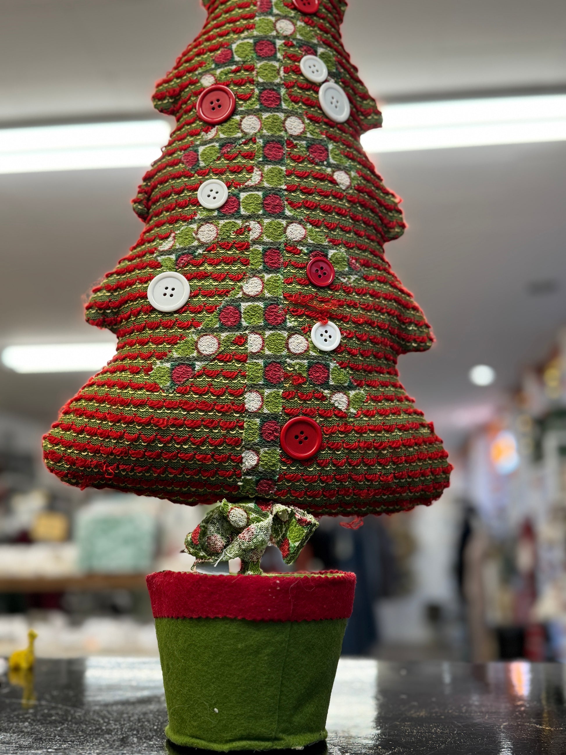 Designed with a crochet-style, textured tiered pattern, this festive tree features alternating red and green layers adorned with white and red button “ornaments” for a whimsical, homemade look. The tree stands securely in a green felt base trimmed with red felt for added warmth and detail.