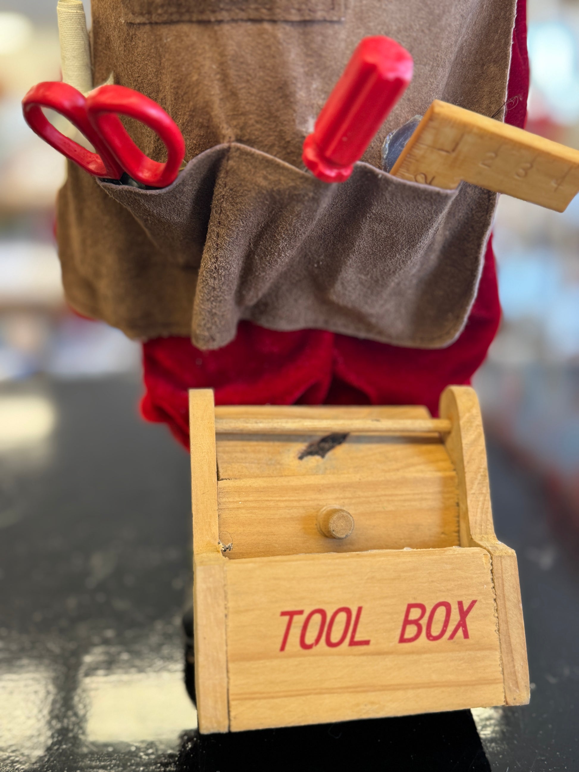 A beautifully handcrafted Toymaker Santa from the Karen Didion Crakewood Collection. This 17–18 inch collectible features Santa dressed in a classic toy-making outfit with a detailed apron, miniature tools, and a wooden toy train. His hand-painted face, expressive eyes, and realistic beard highlight the artistry Karen Didion pieces are known for. The base includes a small wooden "TOOL BOX" accessory, adding charm and authenticity. A perfect display piece for shelves, mantels, or Christmas collector displays.