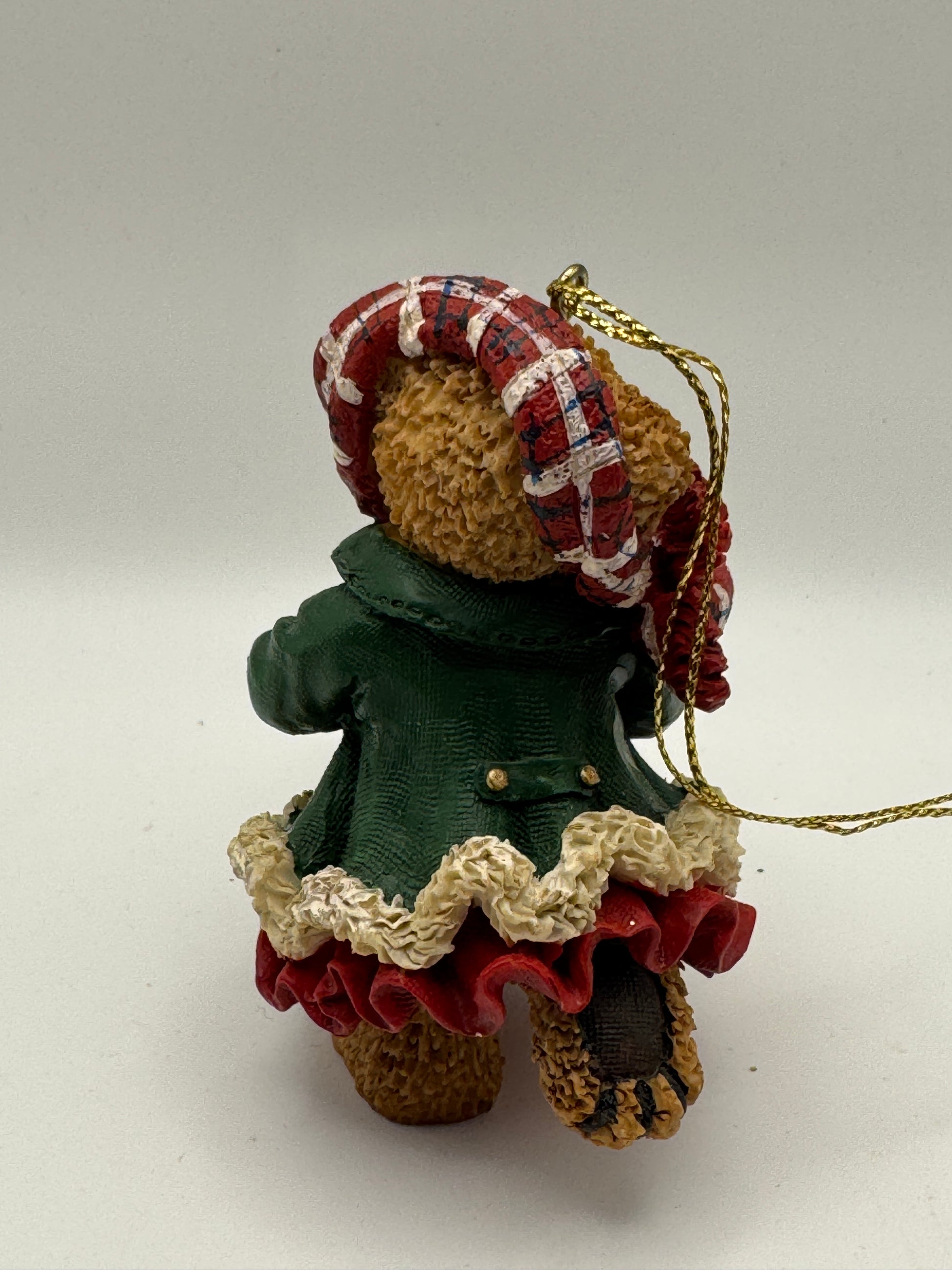 This adorable 3-inch Christmas ornament features a brown teddy bear dressed in festive holiday attire, gently pushing a small stroller. Crafted in the vintage Kirkland style, the piece is full of sweet detail and hand-painted character—perfect for collectors and anyone who loves classic Christmas décor.