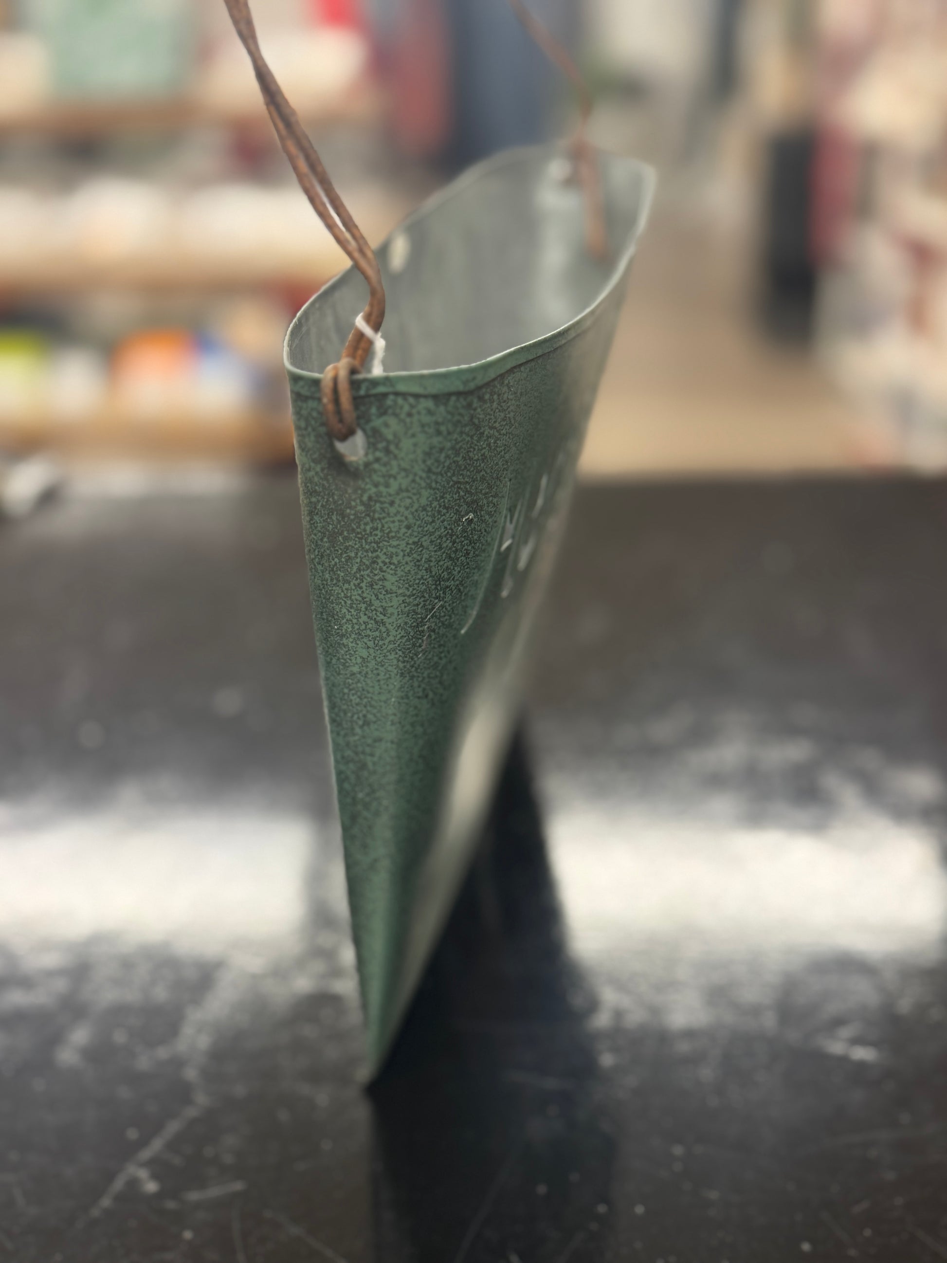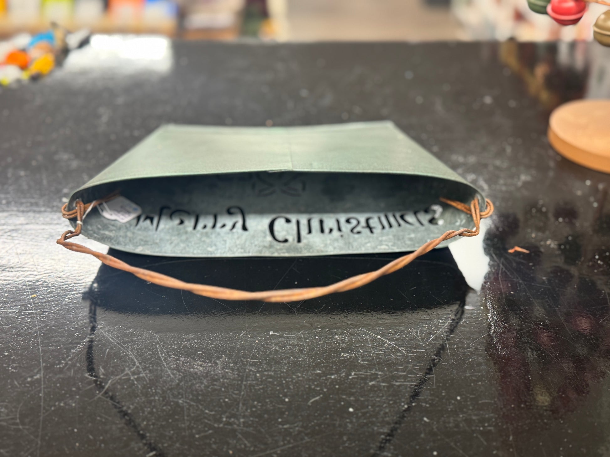 Bring festive charm to your home with this green metal “Merry Christmas” bucket, perfect for adding color and character to your holiday décor.
