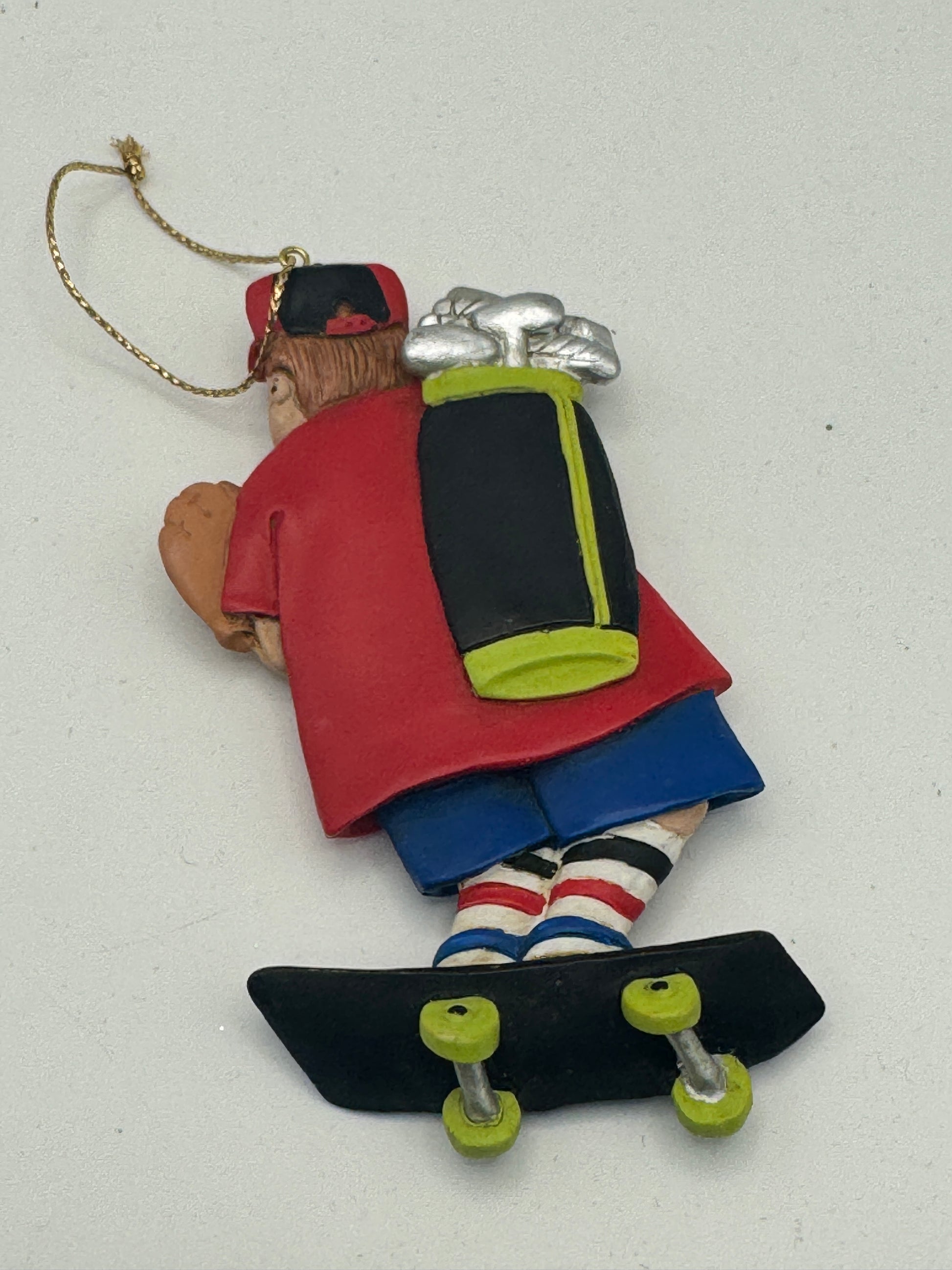 Crafted from durable resin, this collectible piece features a young boy riding a skateboard while holding a football, baseball glove, and a bag of golf clubs—capturing the fun and energy of multiple sports in one whimsical design.