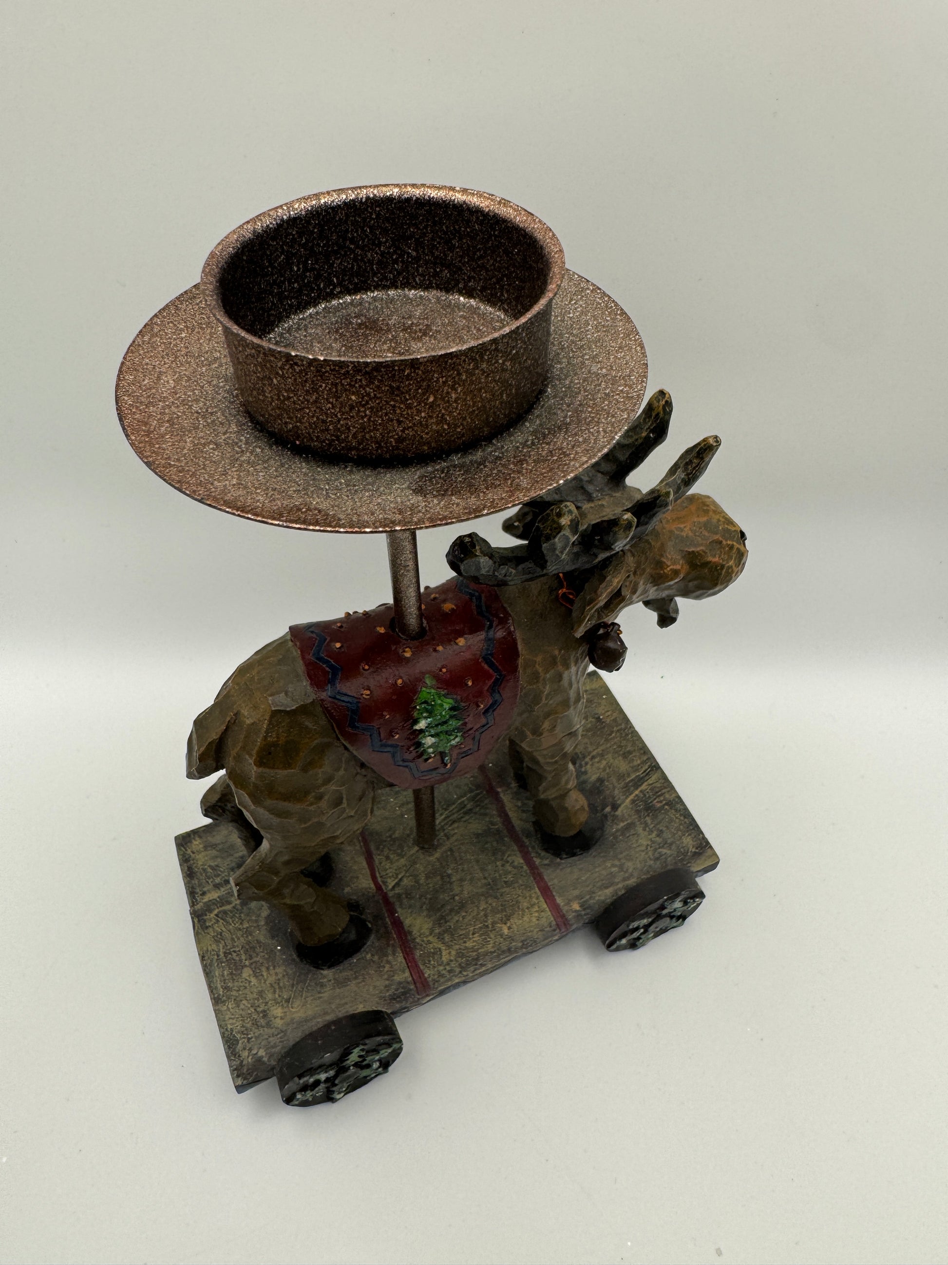 This rustic moose tea light candle holder is crafted from heavy metal and features a charming woodland design. The moose is set on a wheeled platform with holiday-style accents, including a decorated saddle and small jingle bells around its neck. The metal candle plate above securely holds a standard tea light. Measuring approximately 6.5 inches tall and 4.75 inches wide, this piece is perfect for mantels, shelves, holiday vignettes, or lodge-style décor. Great condition and full of character.