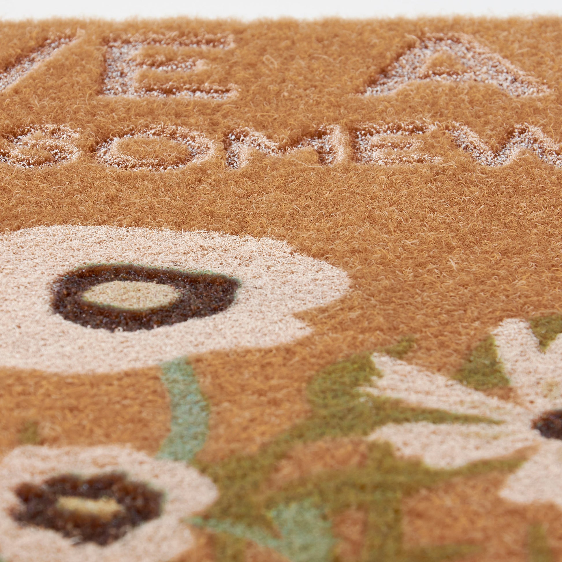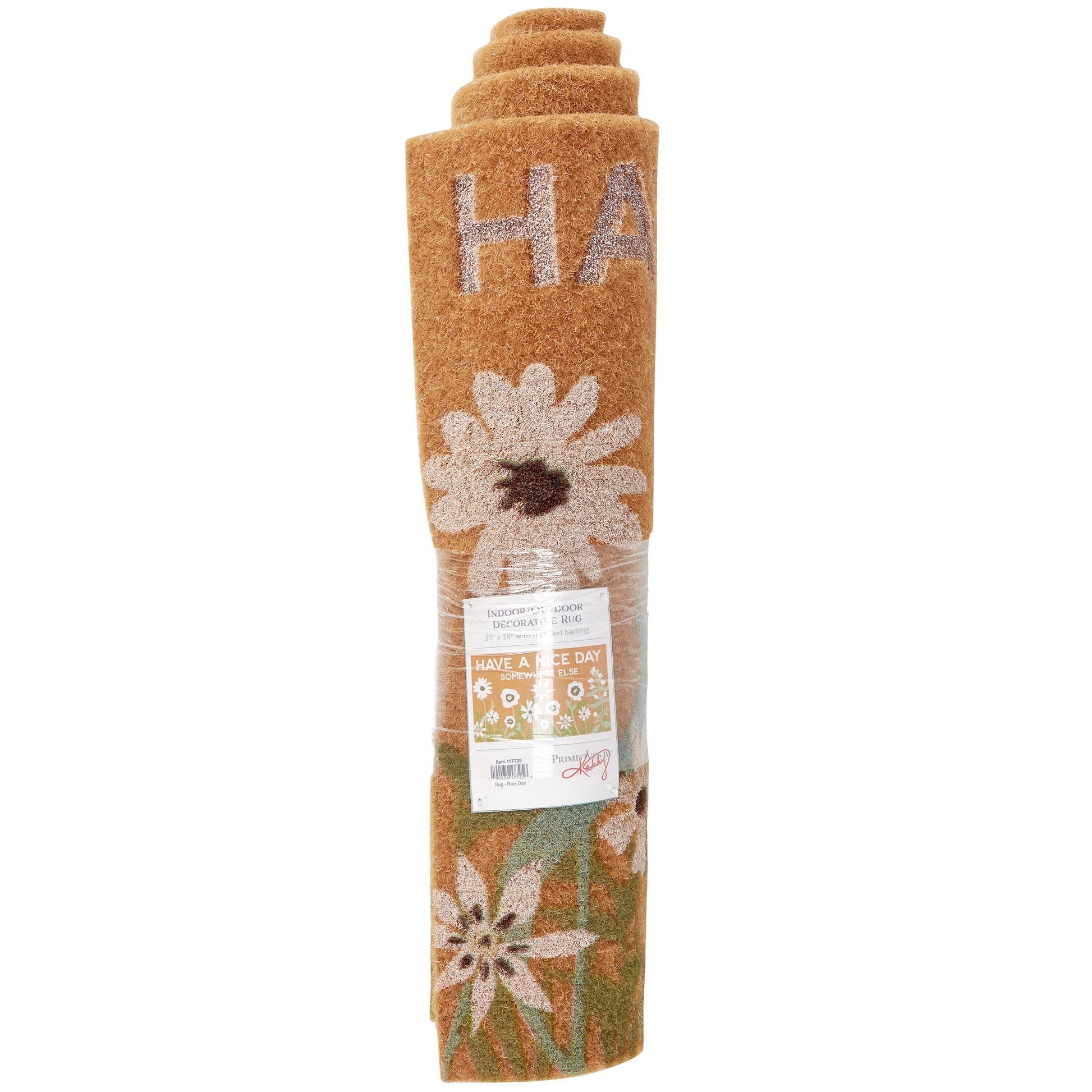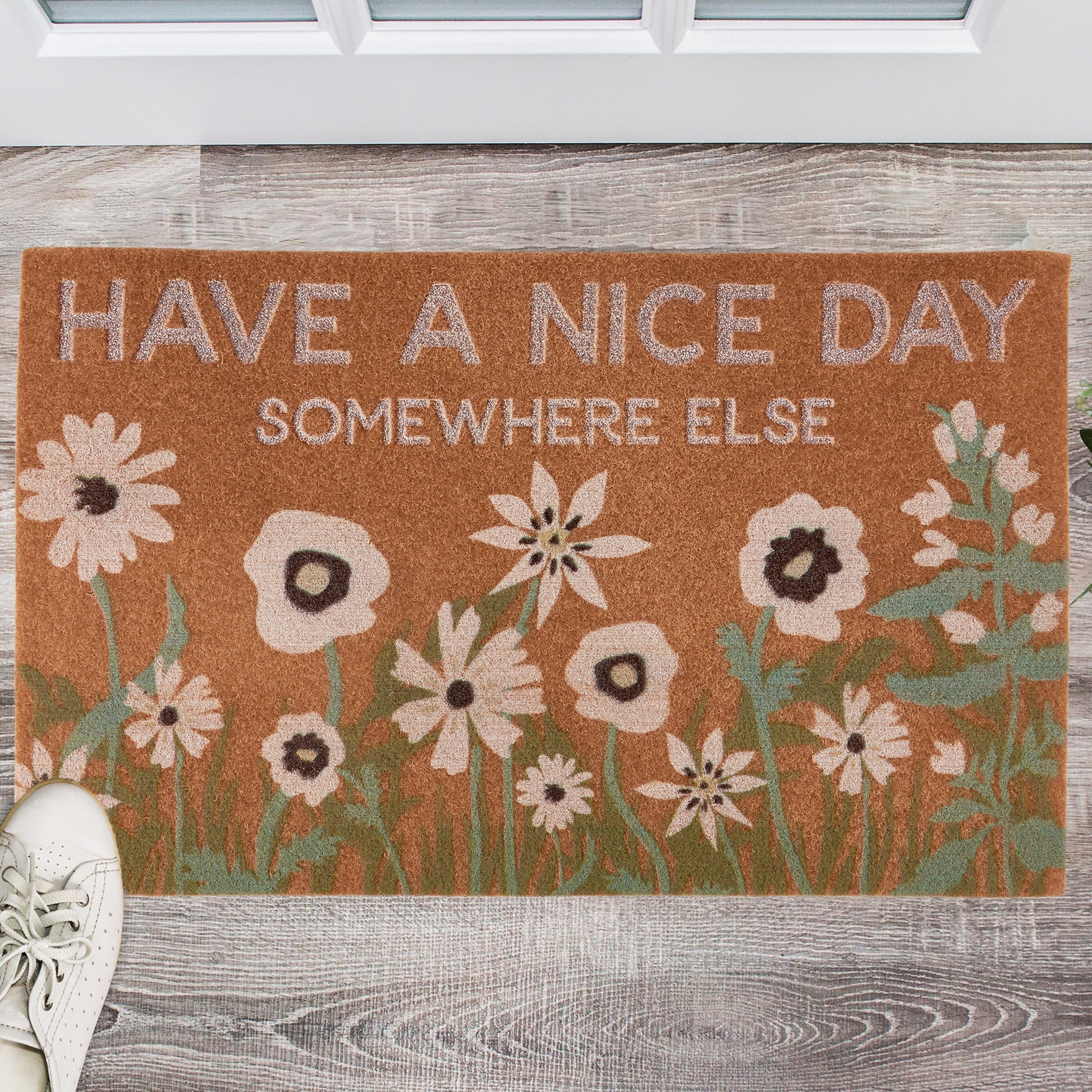 Add a touch of humor to your entryway with this durable faux coir rug featuring the playful sentiment “Have A Nice Day Somewhere Else” accented with floral designs. Designed to look like a classic welcome mat, this rug offers skid-resistant backing and a non-shedding faux coir surface for long-lasting style. Suitable for indoor or outdoor use; spot cleaning recommended.
