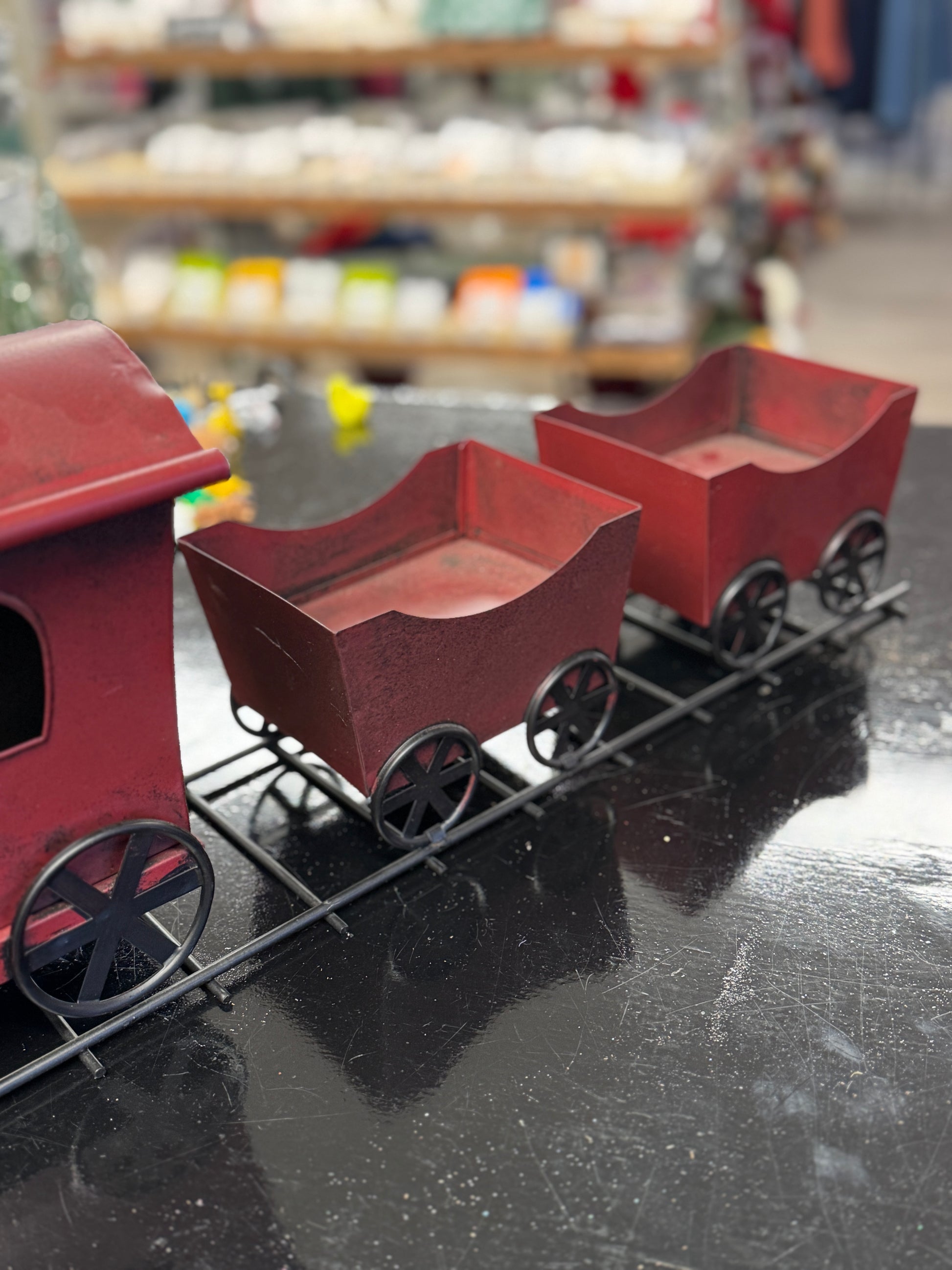 This decorative Christmas train features a classic engine followed by multiple open cars—ideal for adding your own touch with small ornaments, wrapped candies, bottle brush trees, or seasonal accents. Crafted from metal with rustic detailing, the set includes a whimsical wire “smoke” accent rising from the engine for added character.