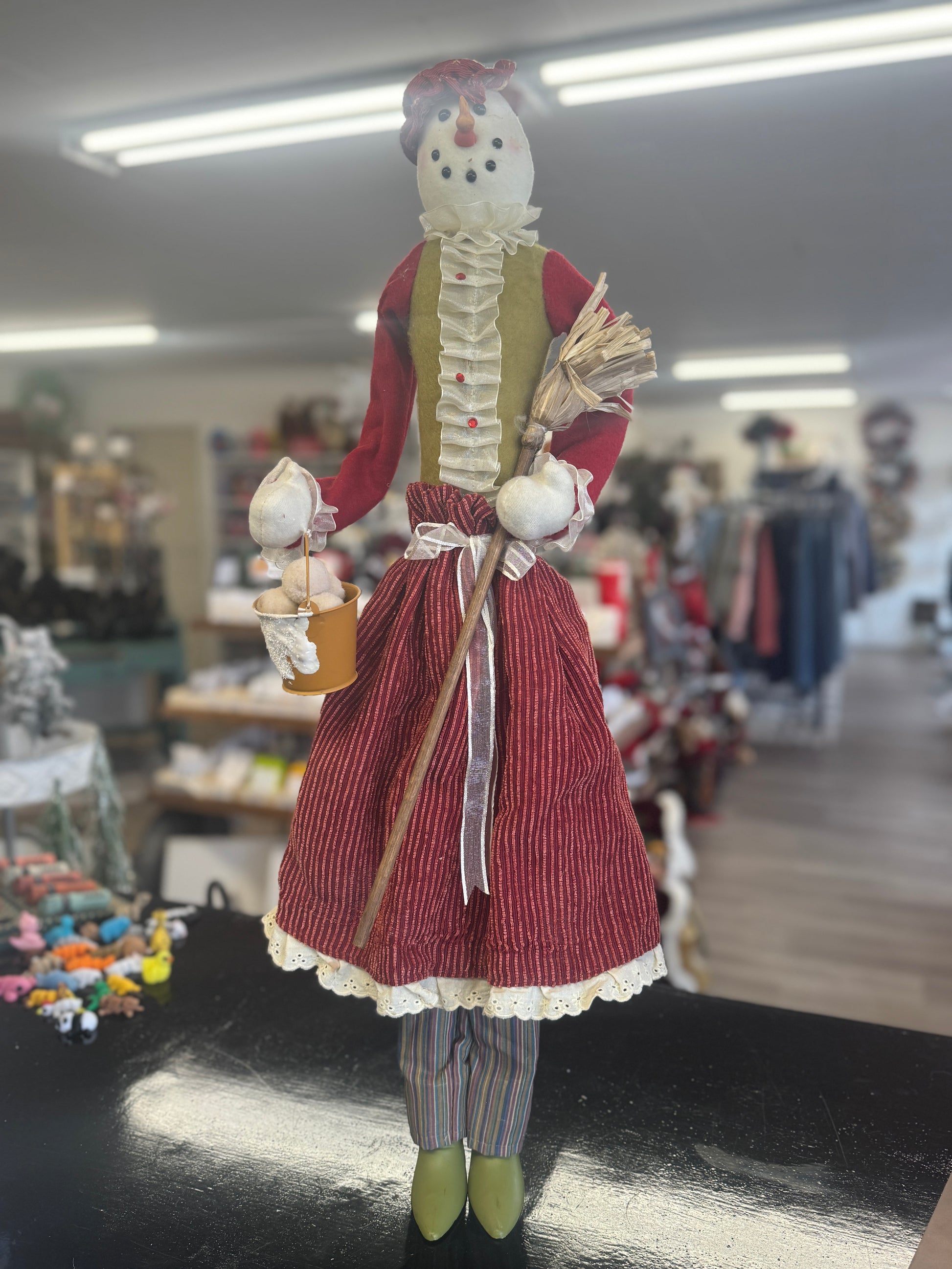 Standing an impressive 28 inches tall, this vintage-inspired snowman features a classic red and white striped skirt, a rustic broom accessory, and soft fabric construction that gives it a warm, homespun look. The primitive design style—known for its muted colors, stitched details, and handcrafted appearance—makes this piece perfect for farmhouse, country, and rustic Christmas displays.