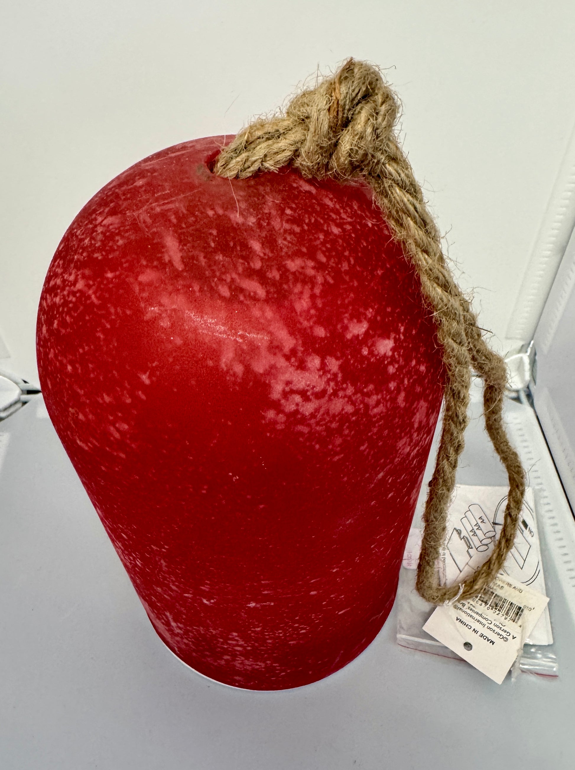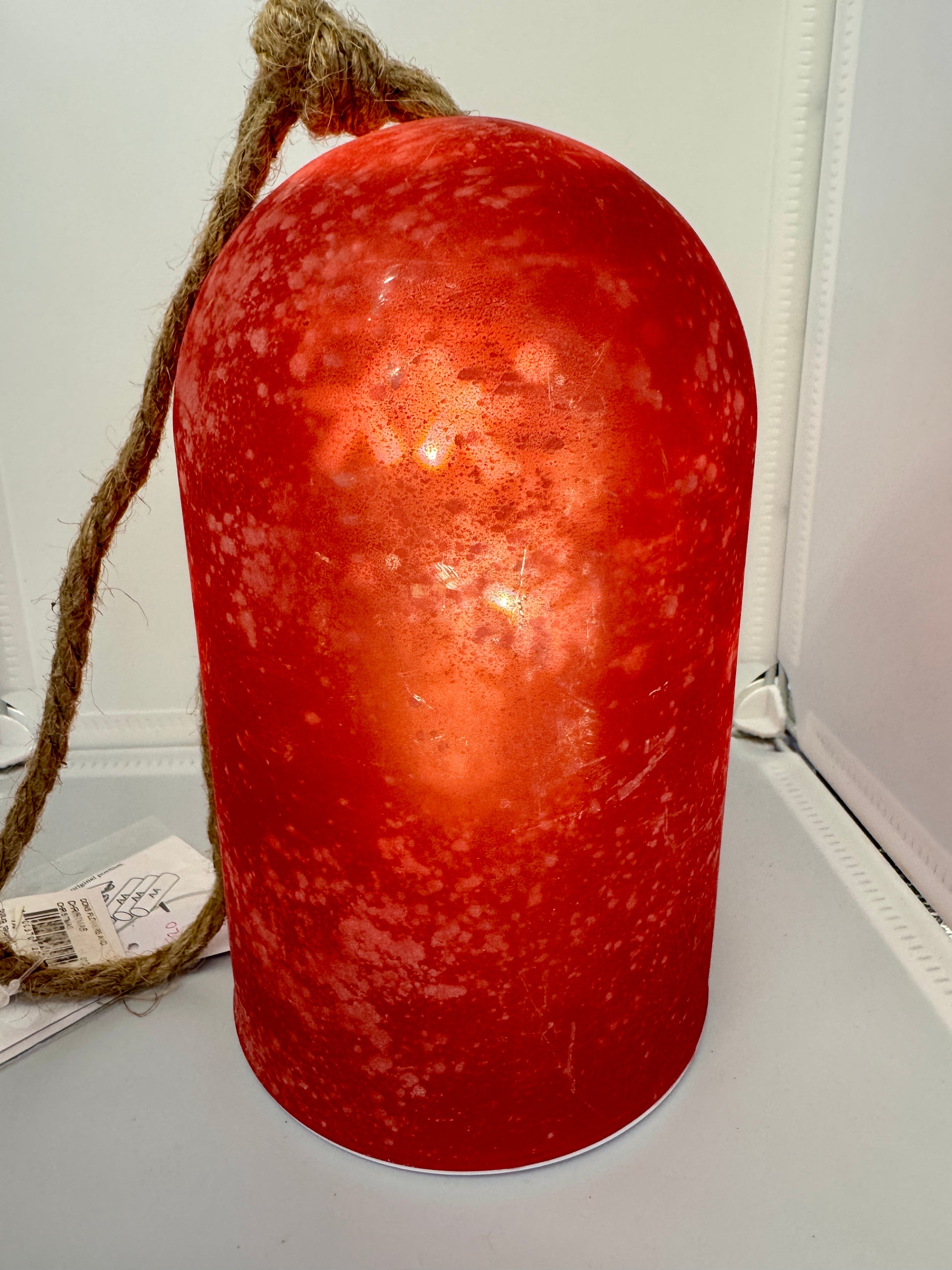Add a warm and festive glow to your space with this Red LED Bell Lantern. Featuring a beautiful frosted red finish and rustic rope handle, this piece brings cozy holiday charm to mantels, shelves, or tabletops. When lit, it gives off a soft, flickering light that creates the perfect seasonal ambiance — no flame required!