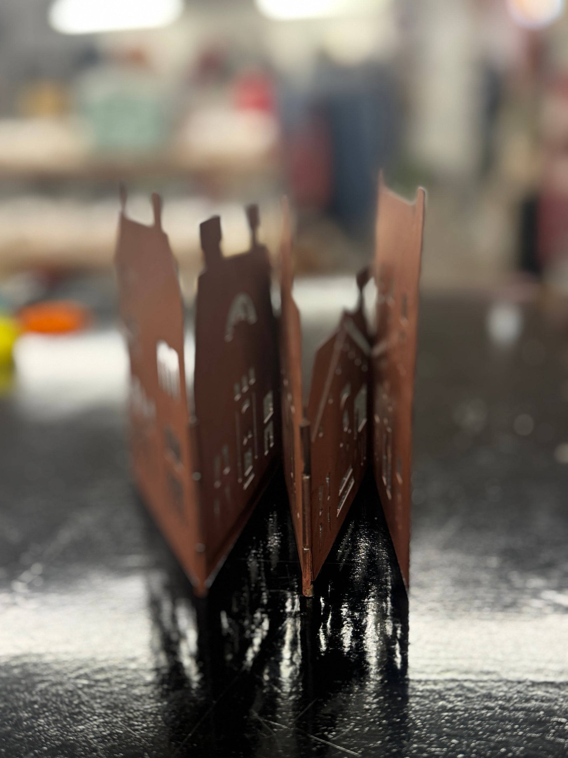 Crafted from distressed, rust-patinated metal, each house features cutout windows designed to beautifully cast shadows when a candle or LED light is placed behind it. These charming pieces deliver an inviting farmhouse, shabby chic, or rustic aesthetic perfect for year-round décor or seasonal displays.