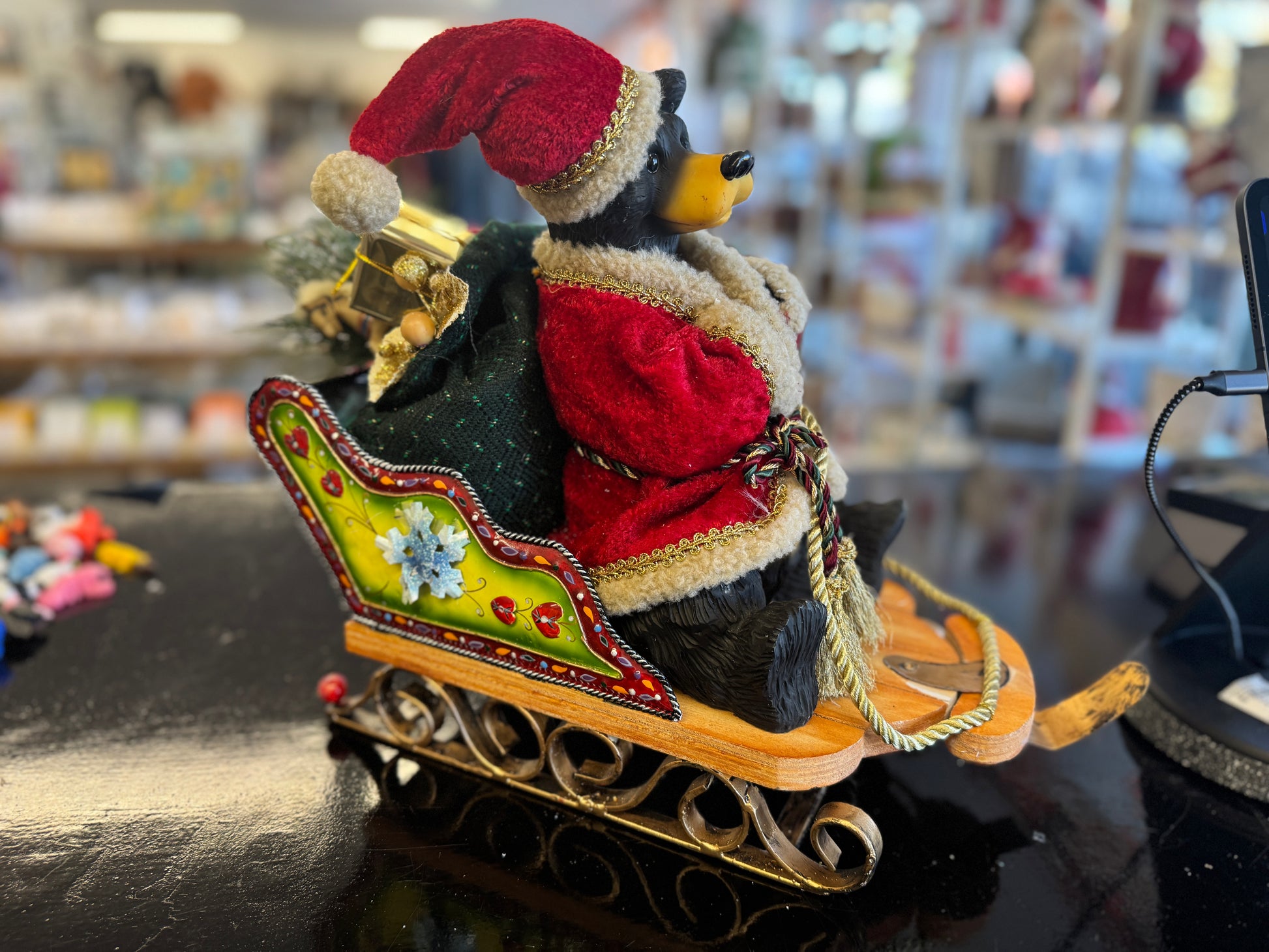 Handcrafted holiday figurine featuring Santa Bear in sleigh