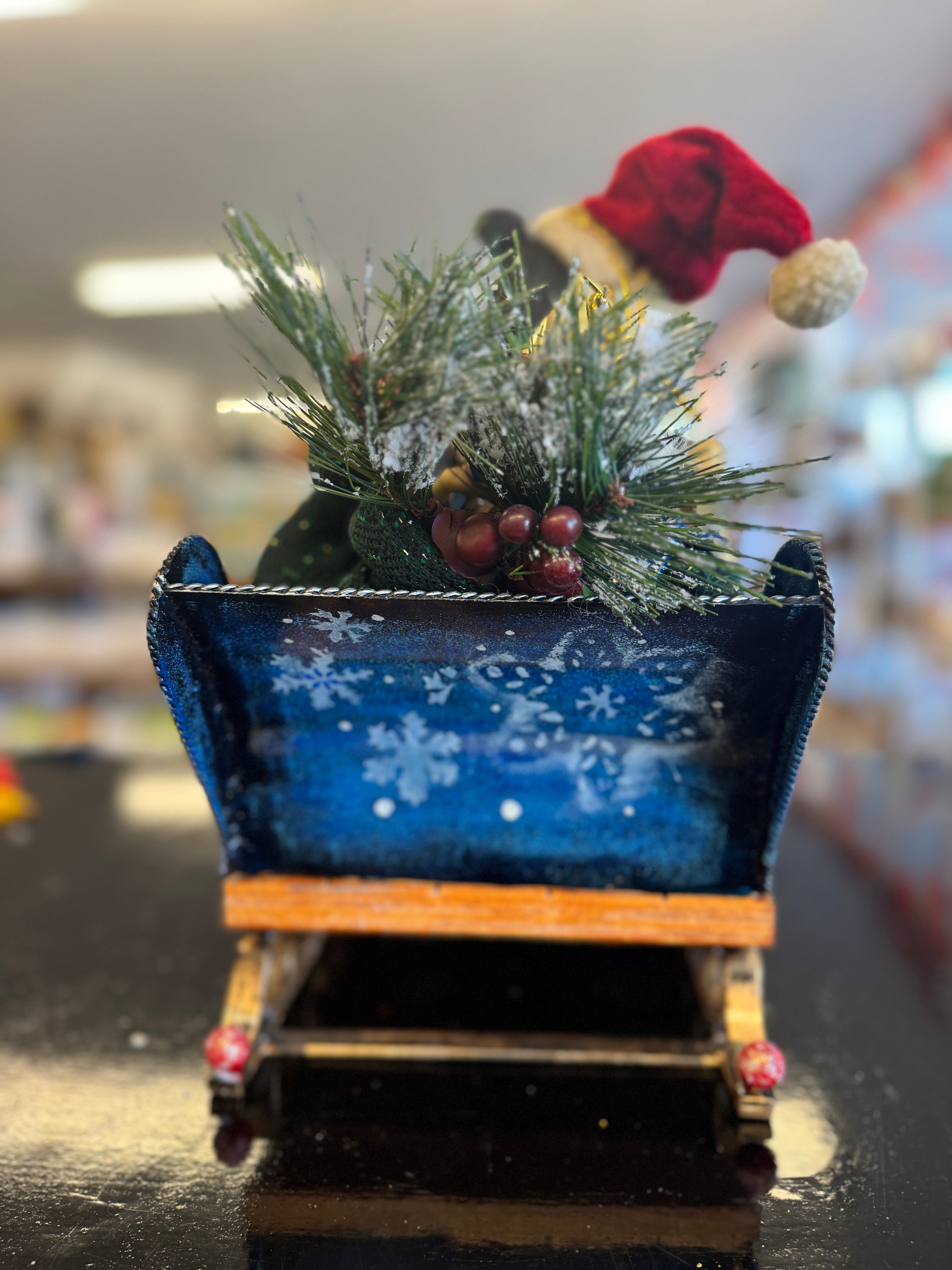 Each side of the sleigh is adorned with hand-painted holiday motifs — including holly, berries, and a blue snowflake accent — set atop elegant gold scroll runners. Measuring approximately 16" x 13", this piece makes a striking statement as a tabletop centerpiece, mantel display, or cabin-style Christmas accent.