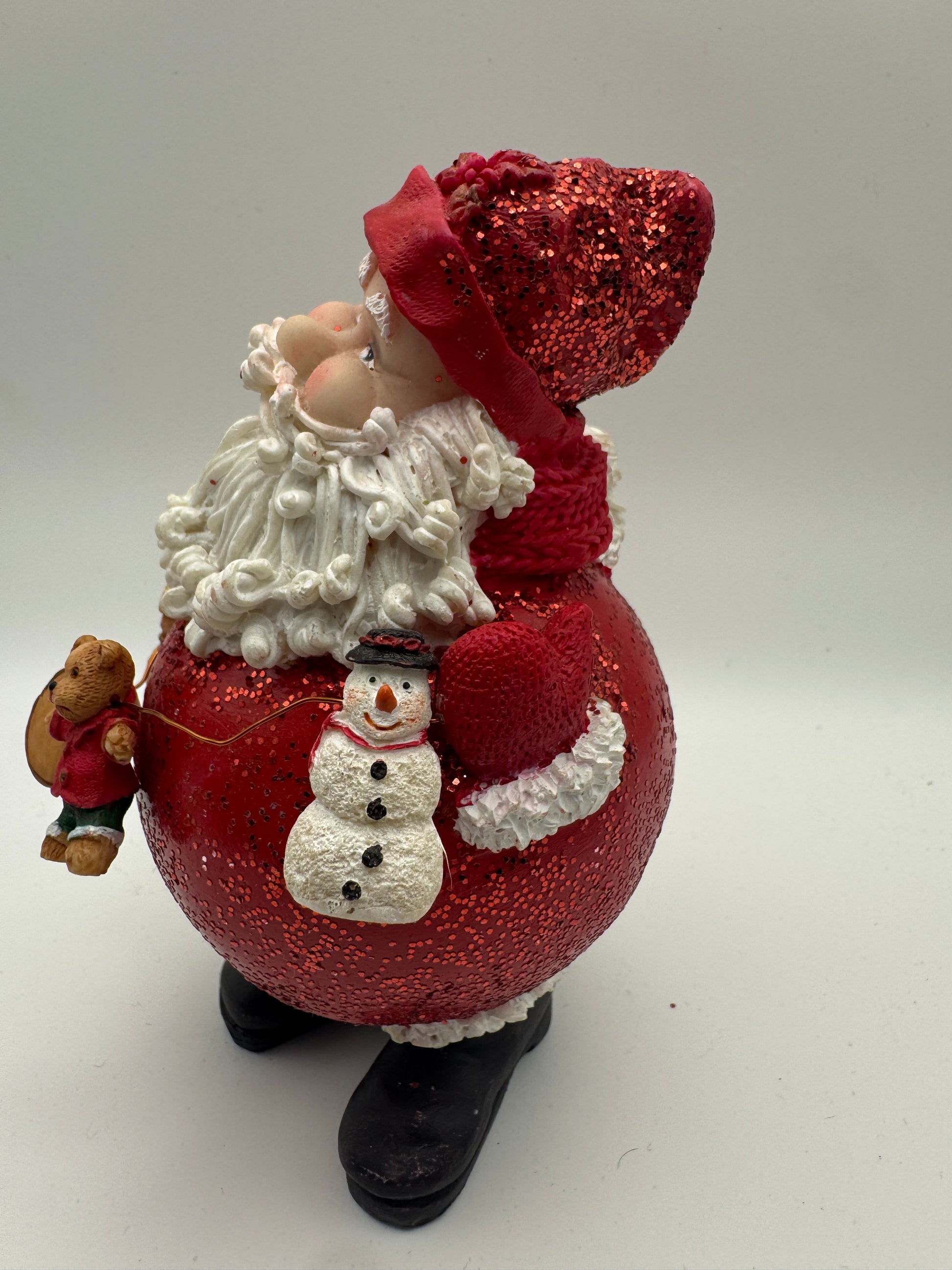 Standing 5 inches tall, Santa holds a festive string of tiny toys—including a miniature teddy bear and a cheerful snowman—bringing a playful and nostalgic feel to any Christmas display. Crafted from durable resin with detailed painting, this petite figurine is perfect for tabletops, tiered trays, mantels, or collector shelves.
