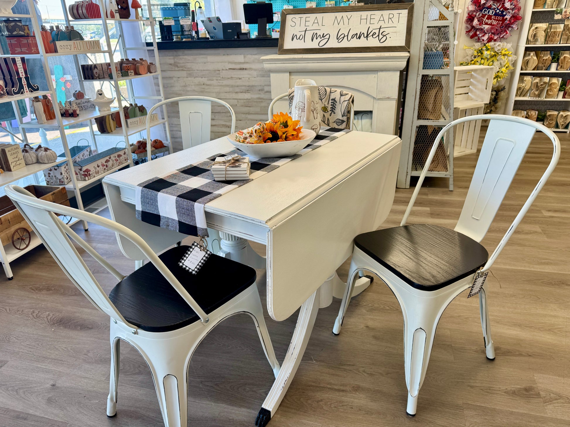 Complete your farmhouse dining set with this set of four beautifully refurbished dining chairs. Designed to perfectly complement our refurbished farmhouse drop-leaf table, these chairs feature a classic silhouette with a cozy, rustic finish that adds warmth to any space.