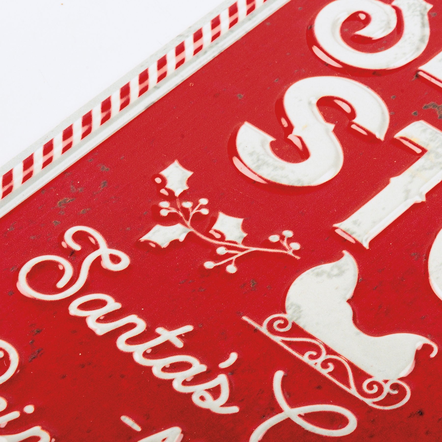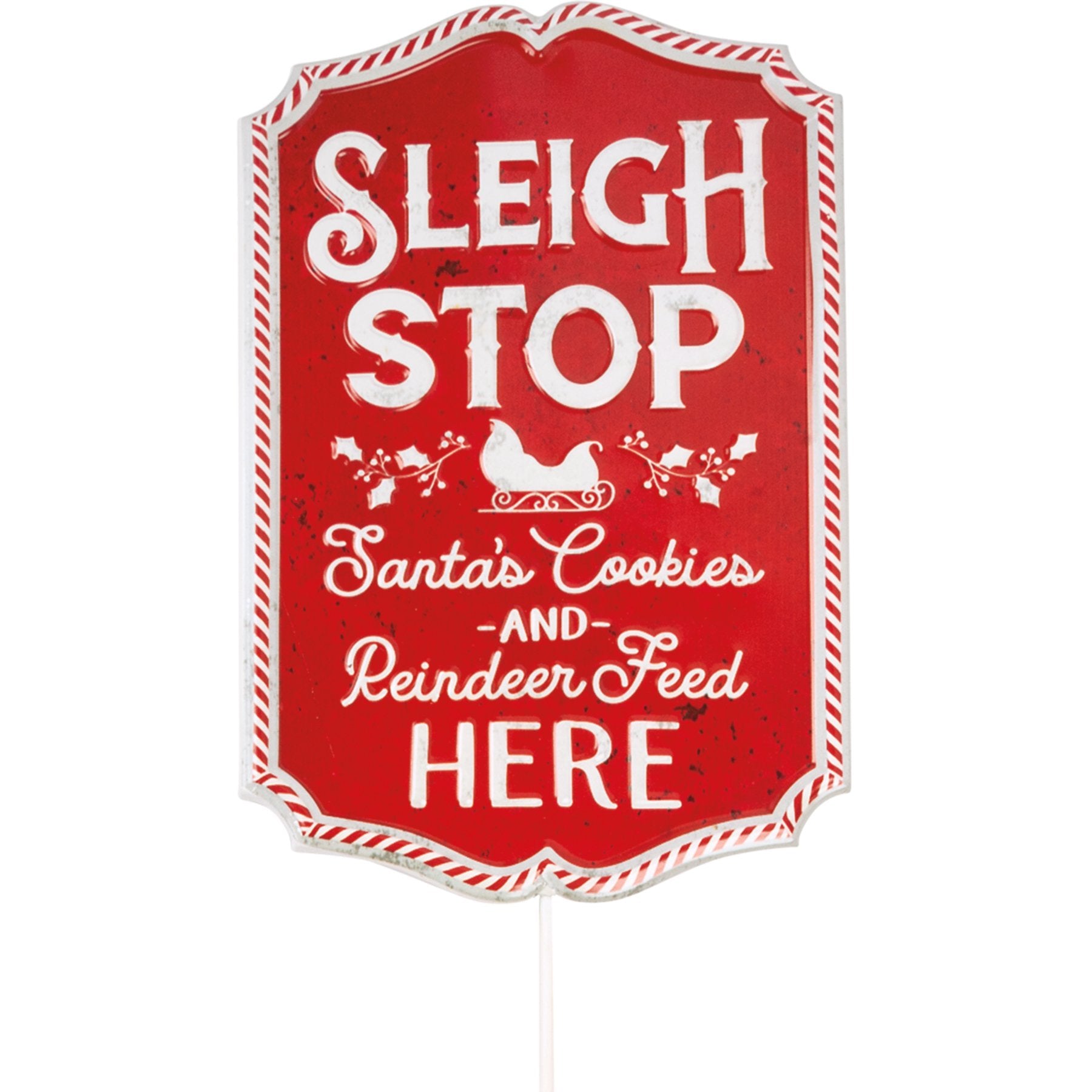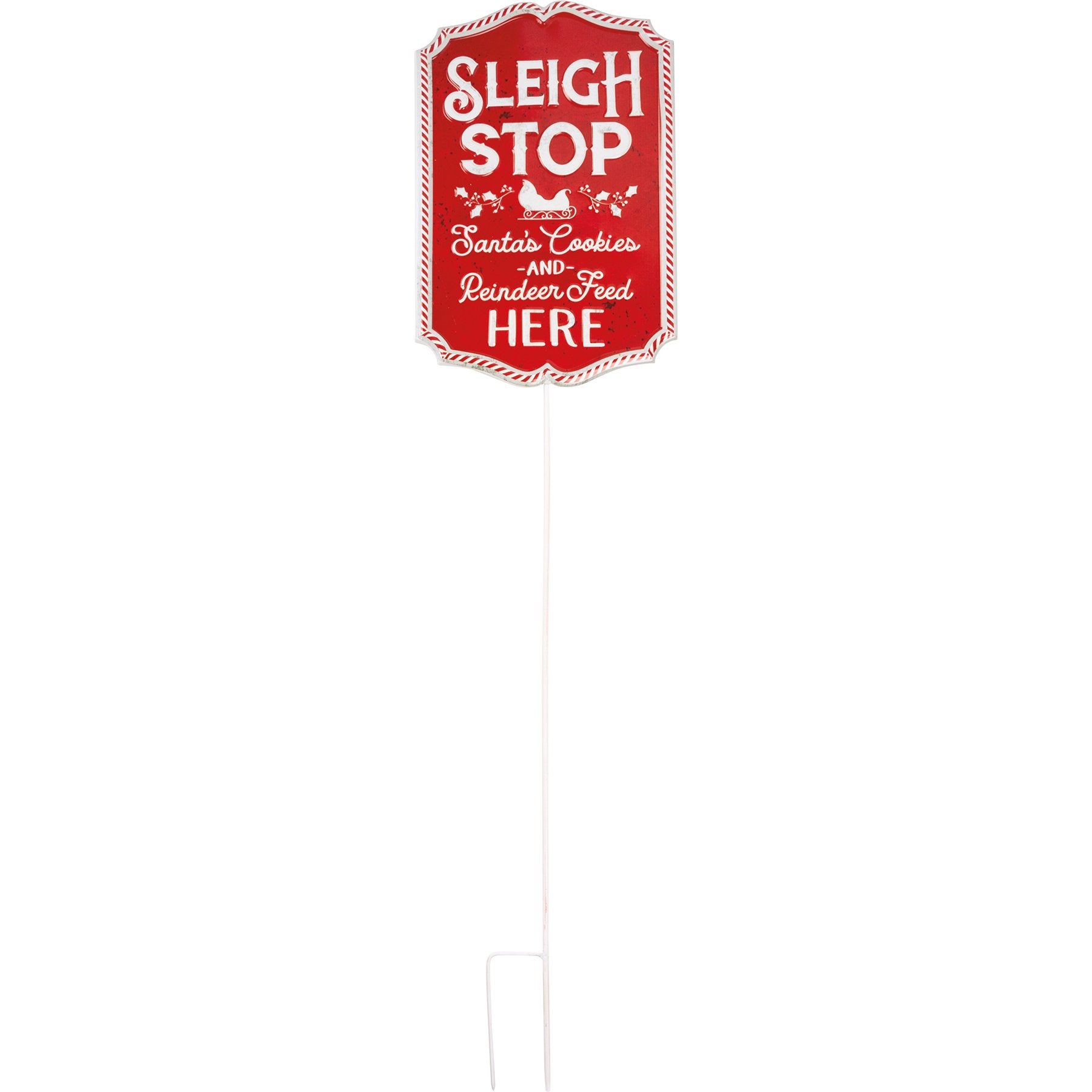 Add a whimsical touch to your outdoor holiday décor with our Sleigh Stop Stake from the Christmas Collection. This festive metal garden stake features a bright red embossed sign that reads “Sleigh Stop – Santa’s Cookies And Reindeer Feed Here” with a charming sleigh design.