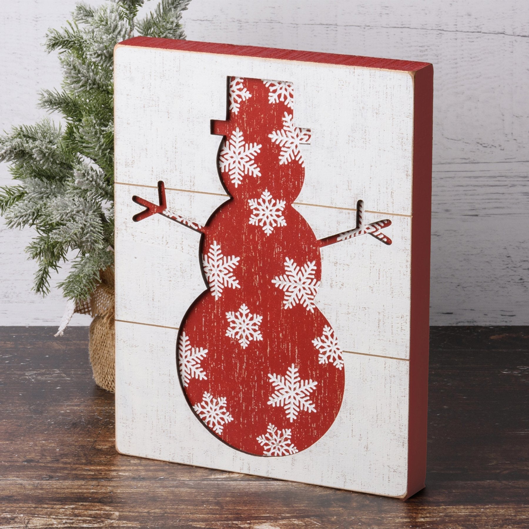 A rustic wooden slat box sign from our Christmas Collection featuring a distressed white face with a cutout red snowman design and debossed snowflake details.