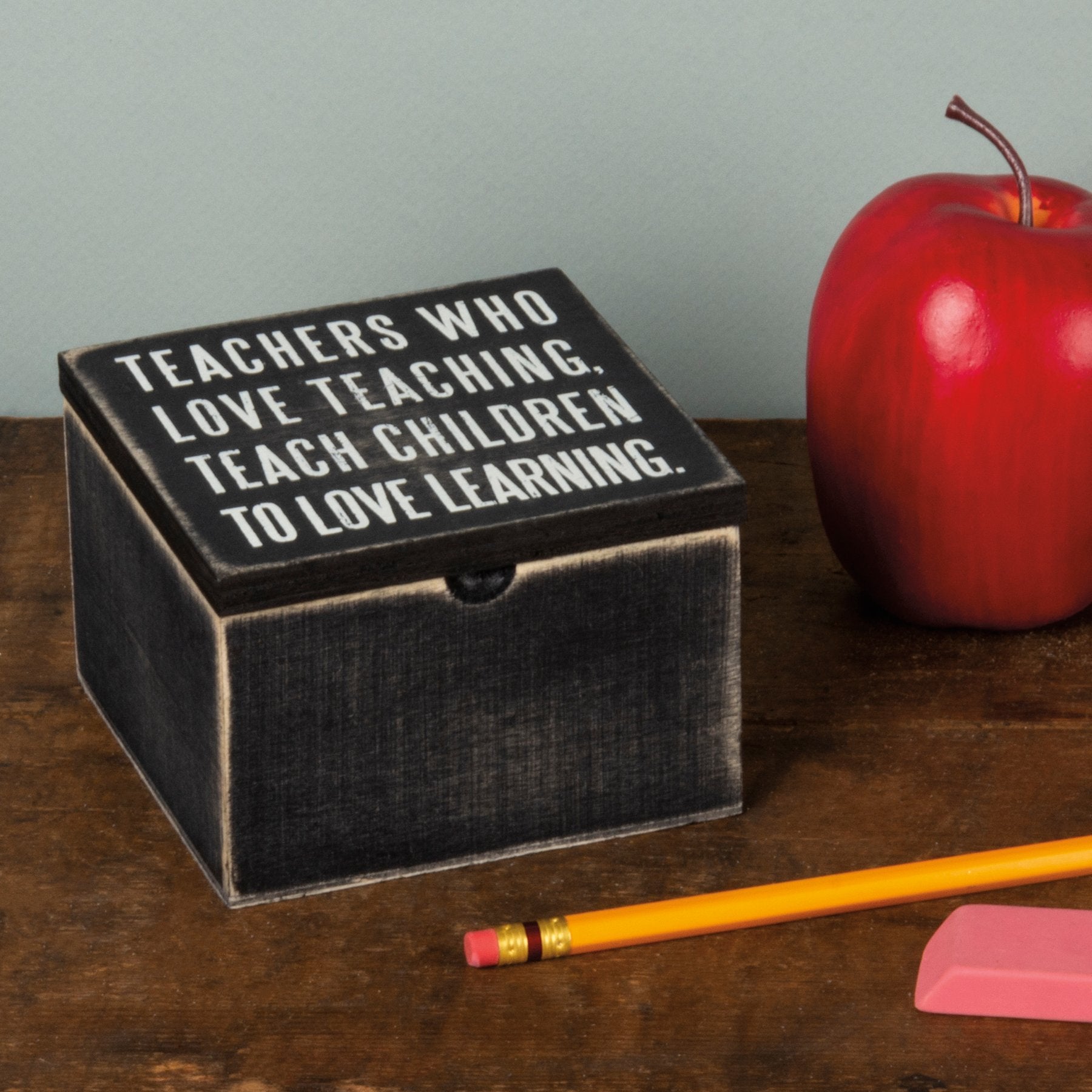 A classic black-and-white wooden hinged box featuring the distressed sentiment: “Teachers Who Love Teaching, Teach Children To Love Learning.” This meaningful piece complements a variety of décor styles and pairs beautifully with coordinating box signs.