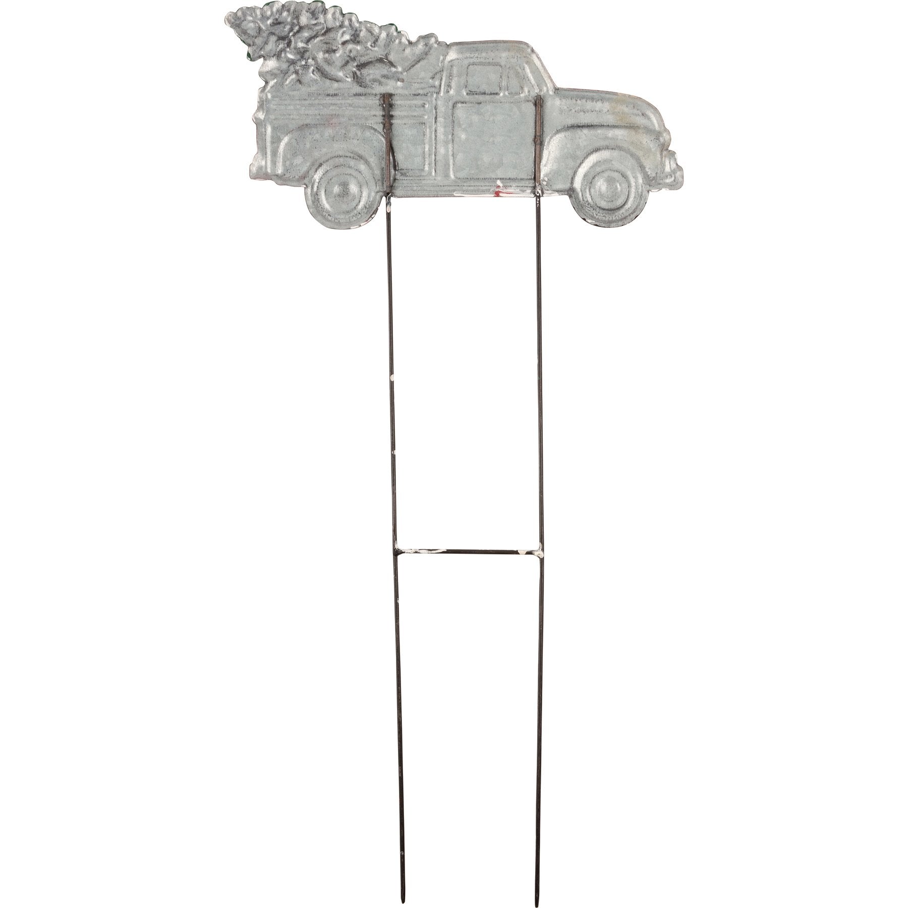 A charming metal garden stake featuring a classic red pickup truck hauling a Christmas tree, complete with embossed detailing for added texture and dimension.