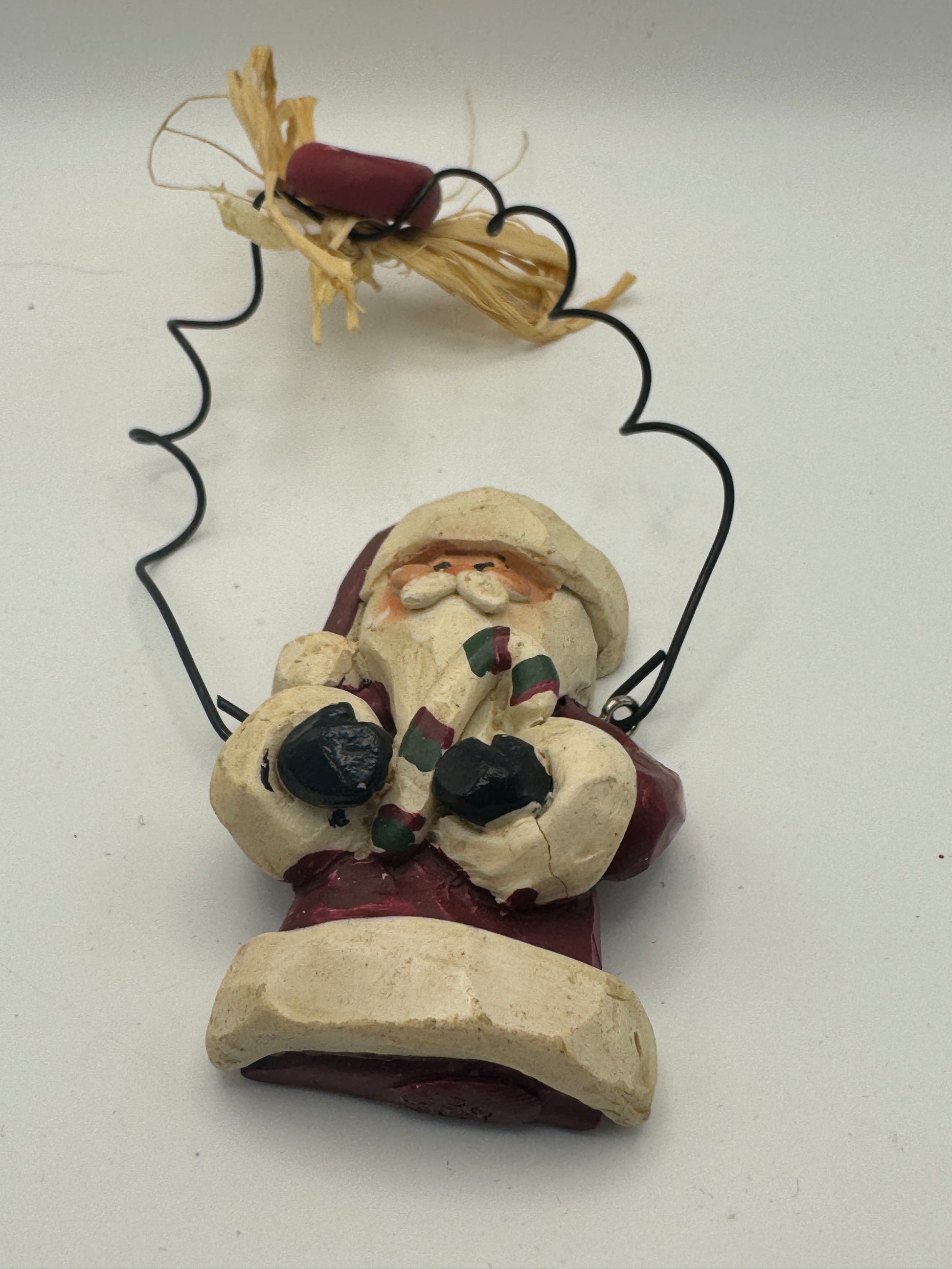 Hand-painted and crafted from durable resin, this charming 3-inch Santa features a joyful expression and holds a small string of festive décor, including a tiny red button and natural raffia accents. Its rustic, homespun style brings warmth and personality to any Christmas tree, wreath, or garland.