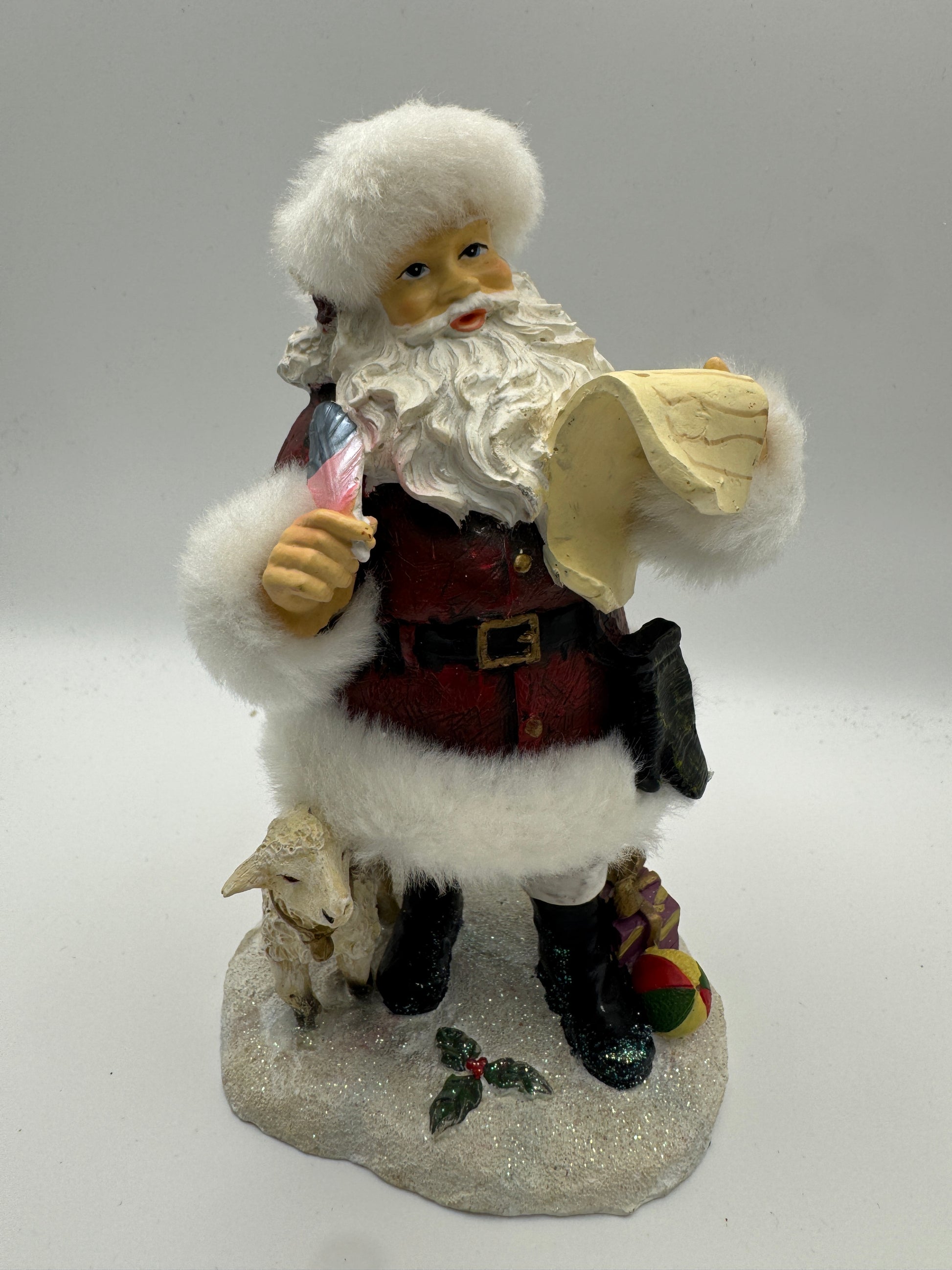 This charming Santa figurine by Young Inc. Holiday Gifts captures the heartwarming spirit of Christmas tradition. Santa is dressed in his classic red and white suit with black belt and boots, holding a scroll and feather pen — ready to check his list twice. At his feet rests a small lamb, symbolizing peace and kindness.